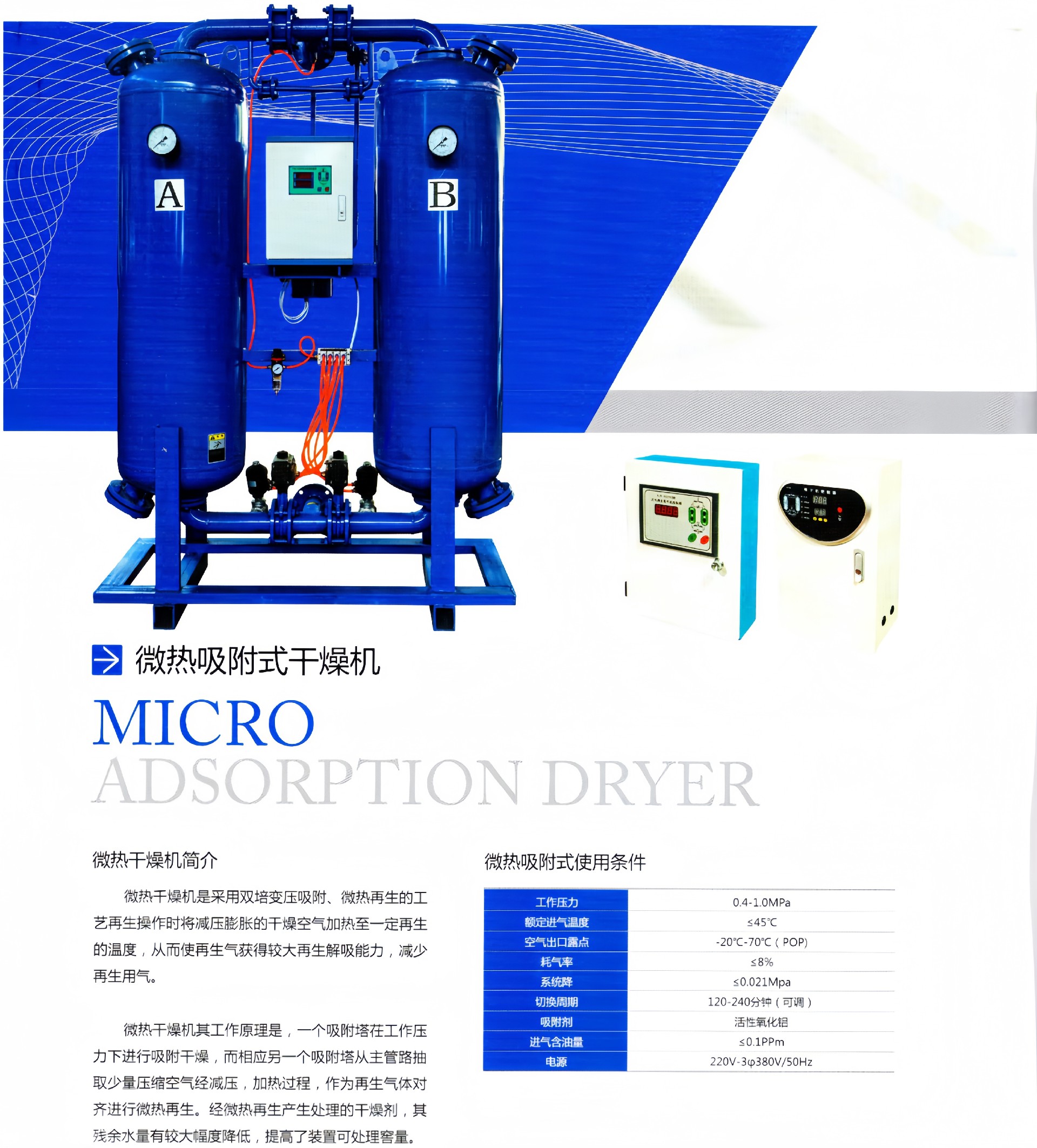 微热再生吸附式干燥机是我司设计和研制,并达到国内行业水平的节能型产品。本系列产品有热再生与无热再生的优点,对再生气采用微加热的形式,从而减少再生气耗量,达到节能的目的。它避免了无热再生干燥机切换时间短的缺点,是目前净化行业经济的节能型吸附式干燥机,被广泛用于冶金、电力、电子、食品、化工、石油、医药、烟草、仪表、和自动控制等行业。